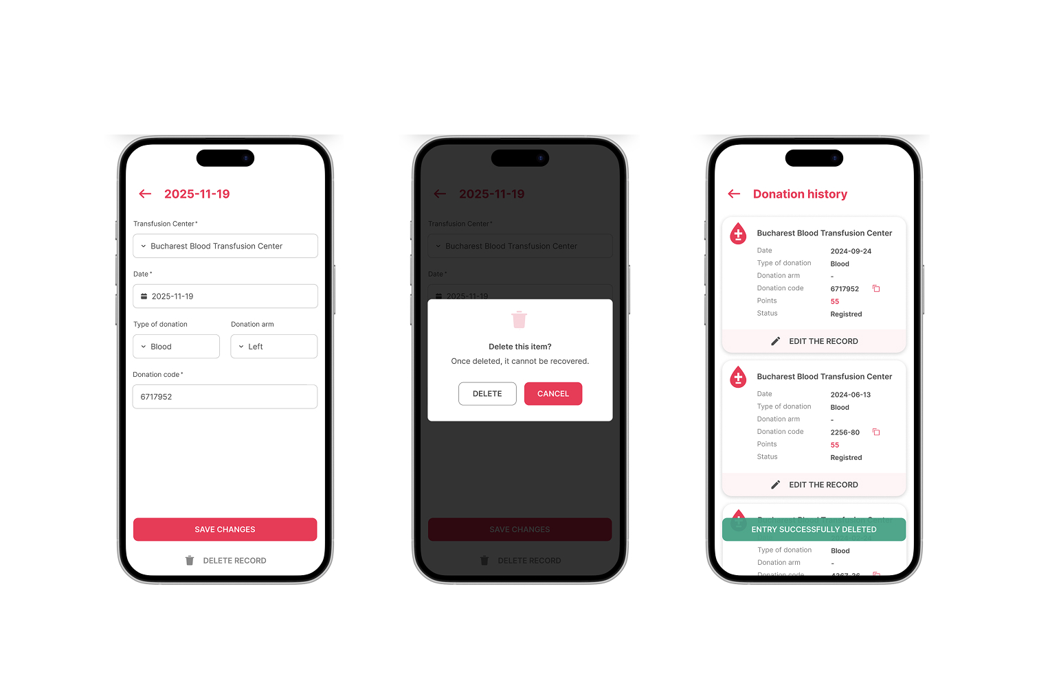 A missing "Edit/Delete" function for donation records forces users into a 90-day lockout if they enter a wrong date—penalizing goodwill actions (donating blood) due to a minor system flaw.